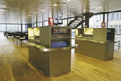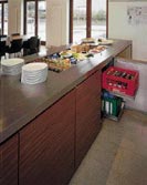 Mobile buffeter udført med diskplade i Corian. Fronter i ask-finér med Corian lister. Opsatse i rustfrie rør/glas. Ergonomiske dispensere for opvaskekurve, som kan integreres med buffeten.