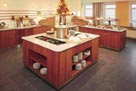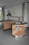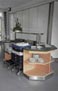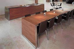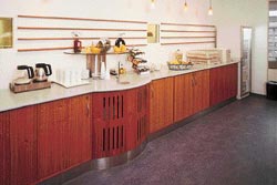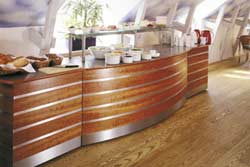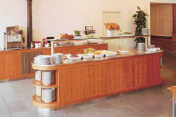 Personalekantine. Diske udført i mahogni. Diskplade i rustfrit stål med indbyggede køle- og varmeplader.