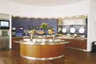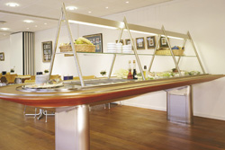 Buffet fritsvævende. Runde søjler udført i rustfrit stål. Diskplade udført i Corian med nedfældet køl. Opsats i rustfrit stål/Corian.