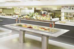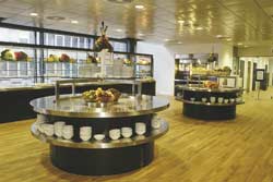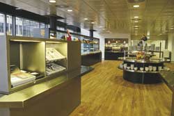 Vue over personalekantinen med to centrale kolde buffeter, én drikkevarebuffet i baggunden og den kolde buffet mod vinduesfacade. Udført i lakeret korpus, rustfrit stål og glas.