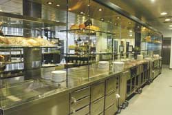 Bagside af den varme buffet, udført helt i rustfrit stål og glas.