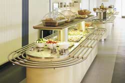 Kantinebuffet. Elegant "svævende" disk. Søjler udført i rustfrit stål og diskplade i mahogni med nedfældet kølekar og varmeplade. Opsats i rustfrit stål og glas.