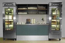 Fritstående buffet med køleplade. Bagdisk for varme og kolde drikke samt med kopper og glas i indbyggede dispensere. Udført i rustfrit stål og kirsebærtræ. Hyldeopsats i glas og med lys.