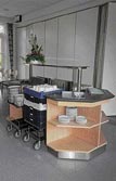 Mobil buffet i rompe-form. Front i laminat med rustfrie hjørnesøjler og spor i Avonite. Udleveringsdisk med varmeplade, kølebrønd, tallerken- og kurvedispensere.